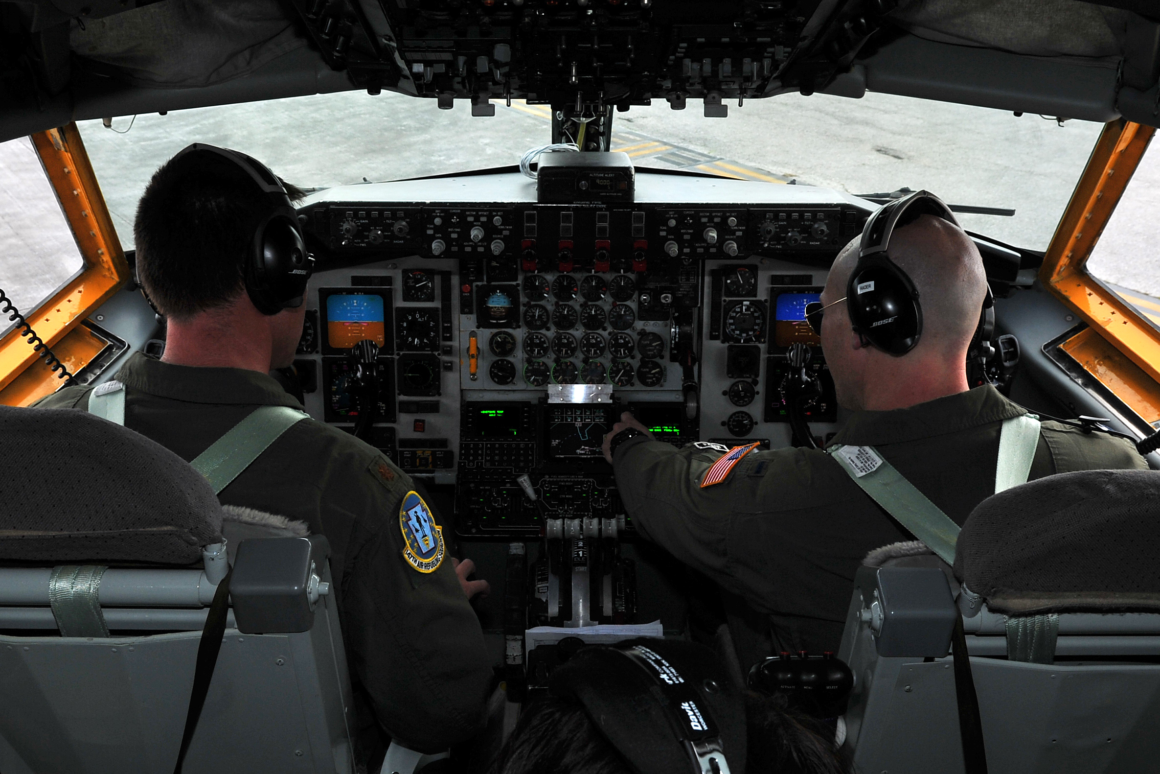 Maj. Scott Fisher, 506th Expeditionary Aerial Refueling Squadron pilot, and 1st Lt. Brandon Rader, 506th EARS co-pilot, implement a preflight checklist prior to departing Andersen Air Force Base, Guam, April 16, 2015, on a KC-135 Stratotanker aerial refueling mission. The tankers routinely support B-52 Stratofortress aircrews with refueling in support of U.S. Pacific Command’s Continuous Bomber Presence in the Asia-Pacific region. Fisher and Rader are deployed to Andersen Air Force Base from the Pennsylvania Air National Guard. (U.S. Air Force photo by Staff Sgt. Melissa B. White/Released)