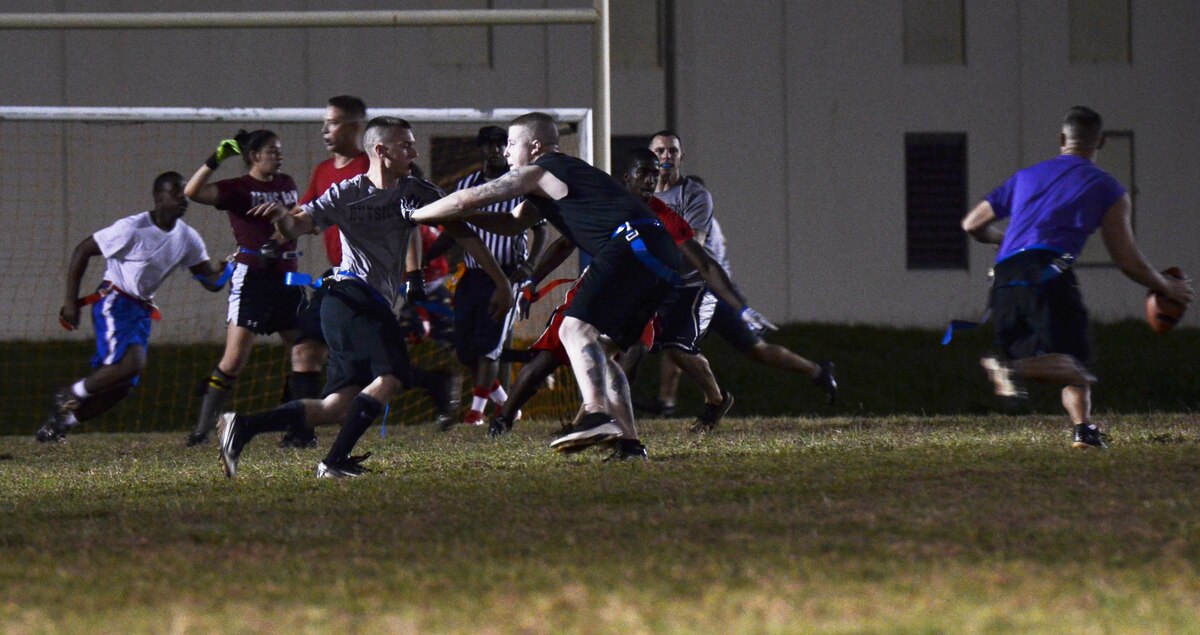The 36th Logistics Readiness Squadron and 36th Force Support Squadron intramural football teams go head to head on Andersen Air Force Base, Guam, Dec. 19, 2013. 36th FSS was defeated by 36th LRS with a score of 21-0. (U.S. Air Force photo by Airman 1st Class Mariah Haddenham/Released)