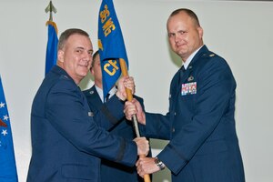 Aug. 10, 2011 36th CPTS makes a change Brig. Gen. John Doucette (left), 36th Wing commander, passes the 36th Comptroller Squadron guidon to Maj. Alan Copeland, newly appointed 36 CPTS commander, during a change of command ceremony at the Sunrise Conference Center here Aug. 9.