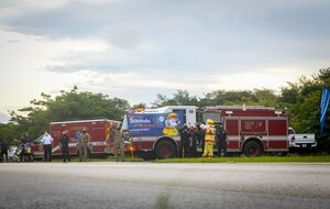 Members of Team Andersen participate in an awareness wave on Andersen Air Force Base, Guam, Oct. 4, 2021. The wave was held to bring awareness to the many October Awareness Campaigns, too include domestic violence awareness month, breast cancer awareness month, fire prevention week, and red ribbon