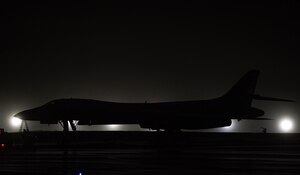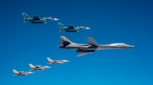 A U.S. Navy MH-60S Knighthawk, U.S. Air Force RQ-4 Global Hawk, Navy MQ-4C Triton, Air Force B-52 Stratofortress’, and KC-135 Stratotankers stationed at Andersen Air Force Base, Guam, perform an "Elephant Walk" April 13, 2020. The Elephant Walk showcases the 36th Wing's readiness and ability to