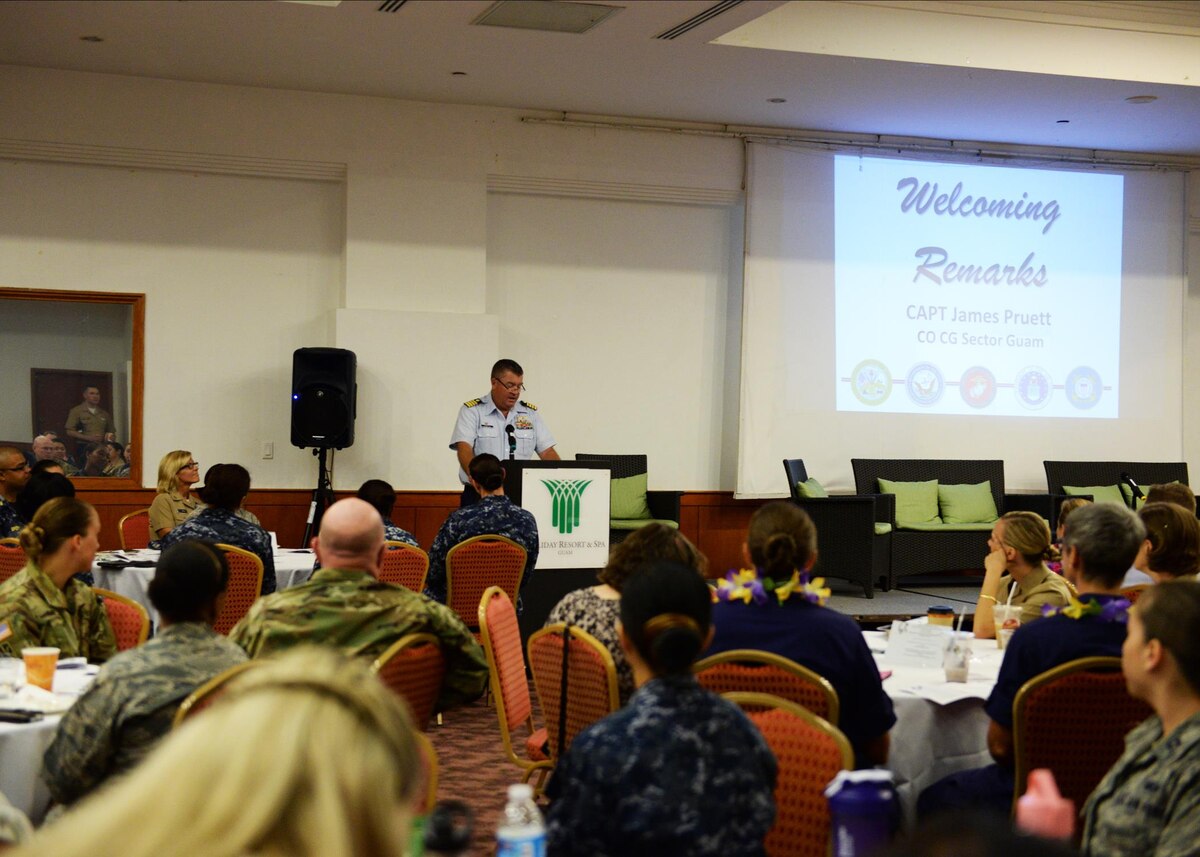 U.S. Navy Capt. Alfred Anderson, Naval Base Guam commander, gives a speech during the Joint Women’s Leadership Symposium, March 24, 2016, in Tumon, Guam. Anderson, who was one of the keynote speakers, shared his life experience as a sailor and the many obstacles he faced throughout his career. The focus for JWLS was to empower women and men with the tools necessary to find their voice and work on leadership skills. (U.S. Air Force photo by Senior Airman Cierra Presentado)