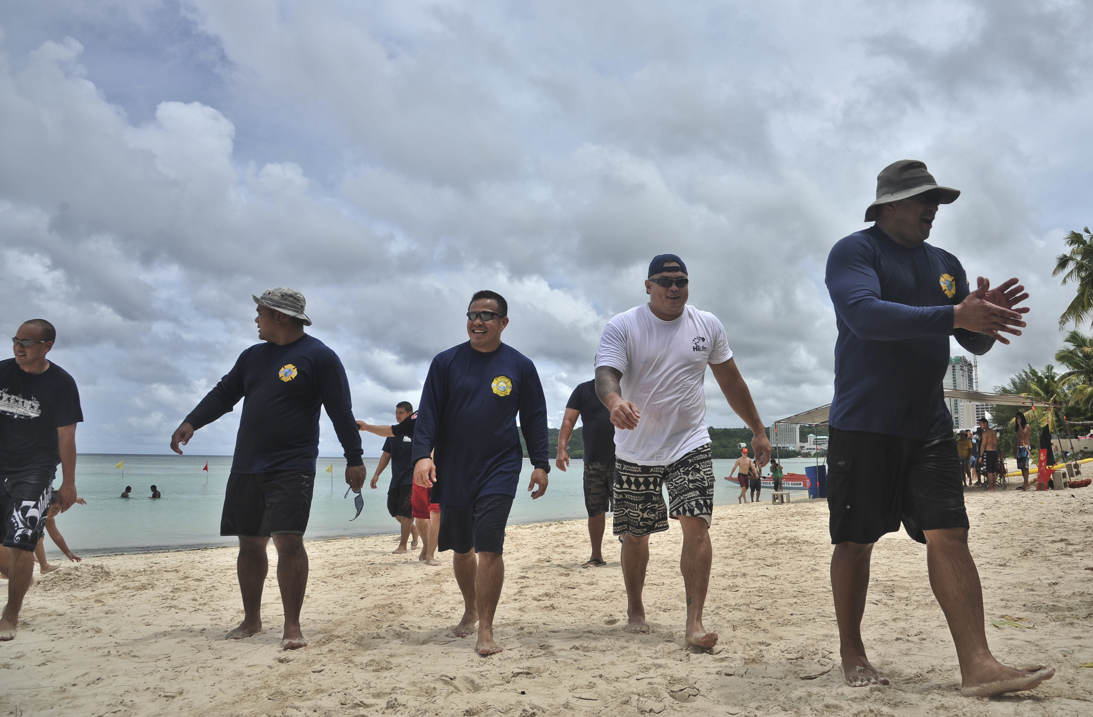 TAMUNING, Guam—Guam Police department dragon boat crew come in for a break after their second heat at the 2012 Second Annual 9/11 Commemorative Dragon Boat Race at Matapang Beach, Sept. 22. This year’s boat Race had 10 person teams including the Guam Police Department, Andersen and deployed-in Kadena AFB Fire Department Airman, Guam Fire Department, Guam National Guard, Naval Fire Department, Navy Tag Five and the Haggan Outrigger Canoe Club. The dragon boat race consisted of eight separate heats competing for time, with the Guam Police Department taking the overall win with 2:12.63 seconds. (U.S. Air Force photo by Staff Sgt. Alexandre Montes/Released)
