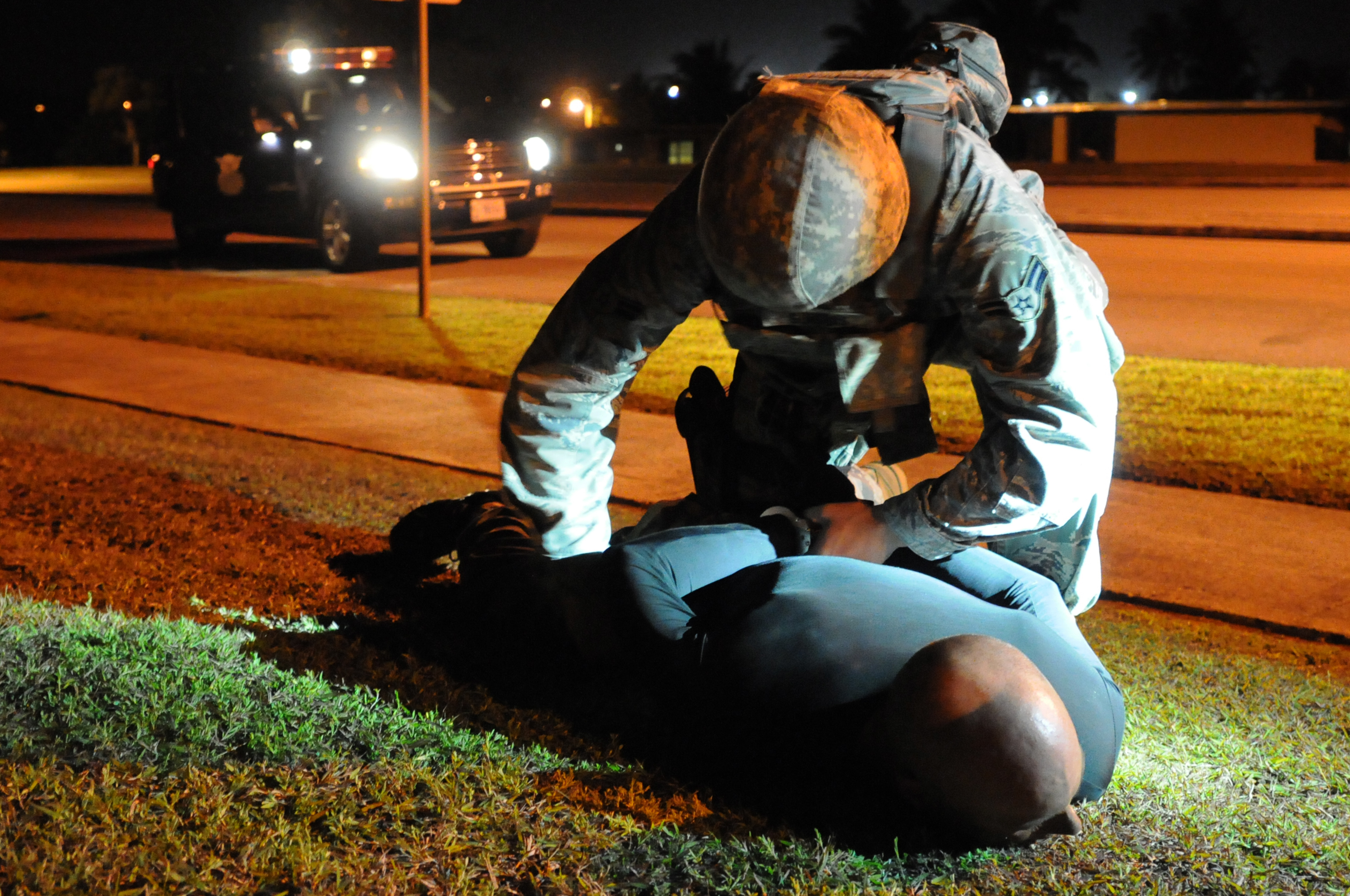 ANDERSEN AIR FORCE BASE, Guam - Airman 1st Class Paul Gingras, 36th Security Forces Squadron, searches a suspect during an Operational Readiness Exercise here, March 2. The ORE scenario was designed to evaluate the response of security forces personnel should an individual suspected of terrorist activity escape on base. (U.S. Air Force photo/Senior Airman Carlin Leslie)