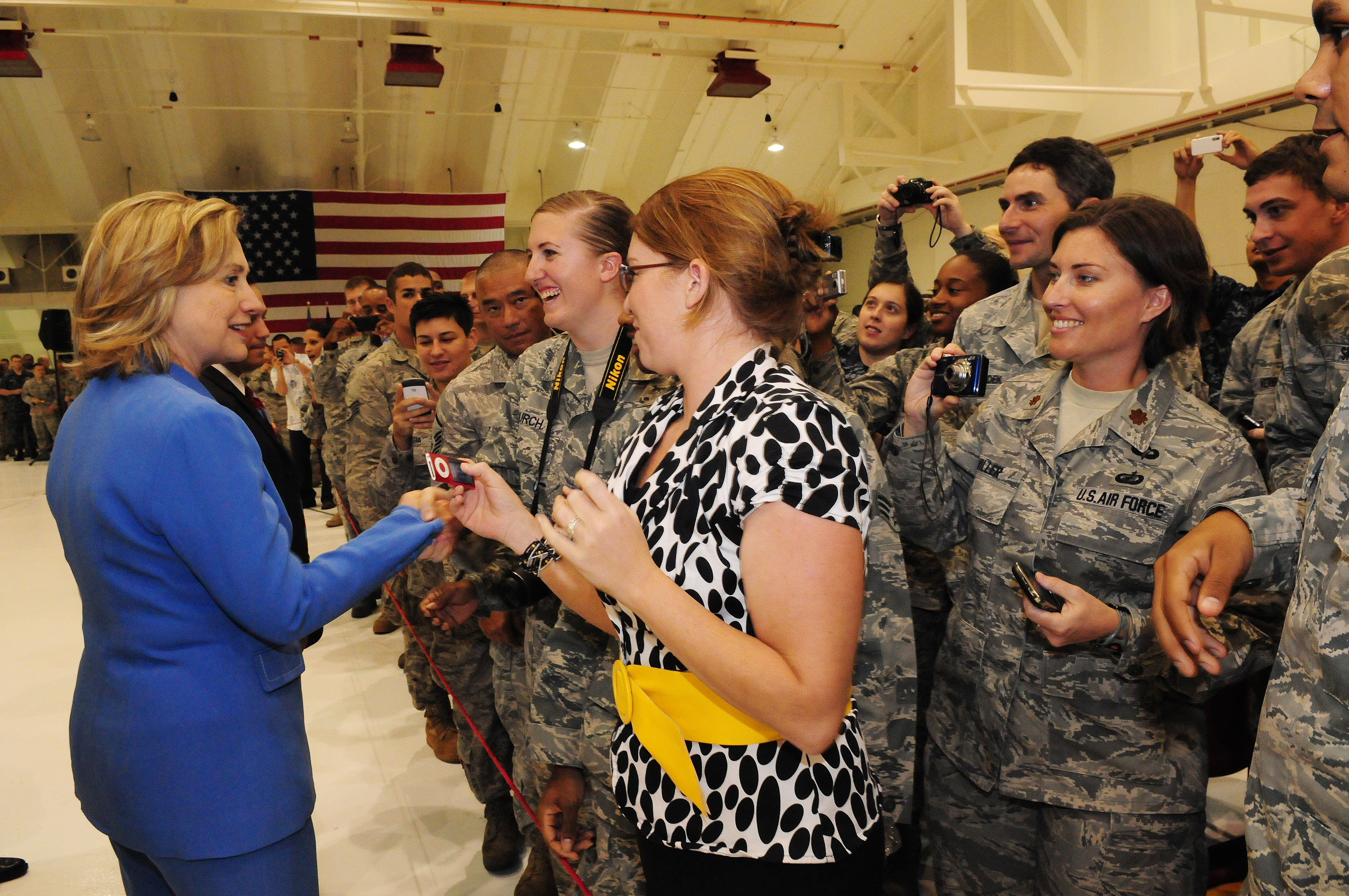 Secretary of State of the United States Hillary Rodham Clinton shakes hands of servicemembers at Andersen Air Force Base Oct. 29, 2010. Clinton visited the base as part of her trip to the Asia-Pacific Region. She reaffirmed Guam?s importance to the nation, and her gratitude to the service members for their dedication and sacrifice. (U.S. Air Force photo /Senior Airman Nichelle Anderson/ released)