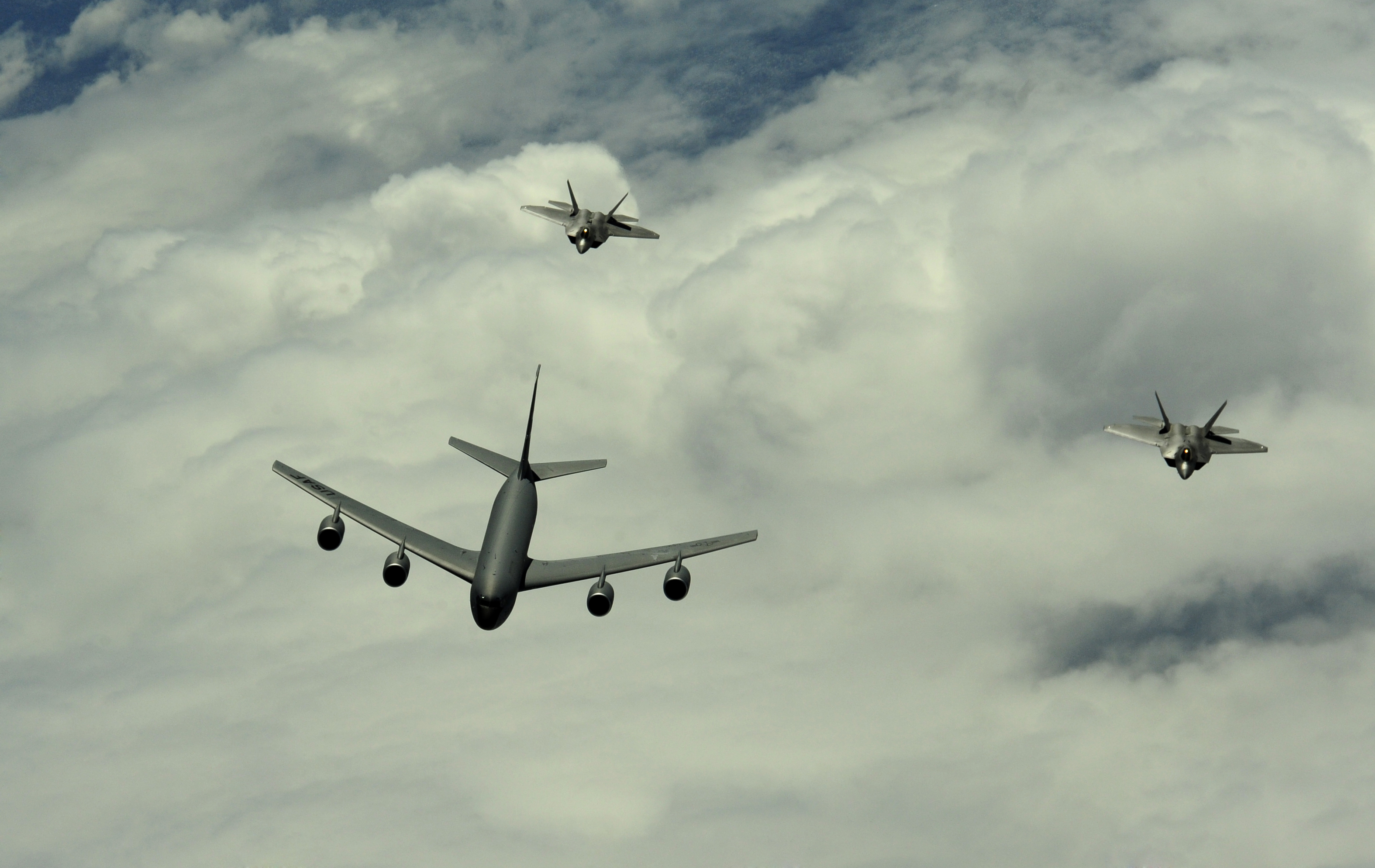 A U.S. Air Force F-22 Raptor assigned to the 90th Fighter Squadron, Elmendorf Air Force Base, Alaska, receives fuel from a KC-135 Stratotanker assigned to the 465 Air Refueling Squadron, Tinker AFB, Okla., near Guam, Feb. 17, 2010. (U.S. Air Force photo by Staff Sgt. Andy M. Kin / Released)