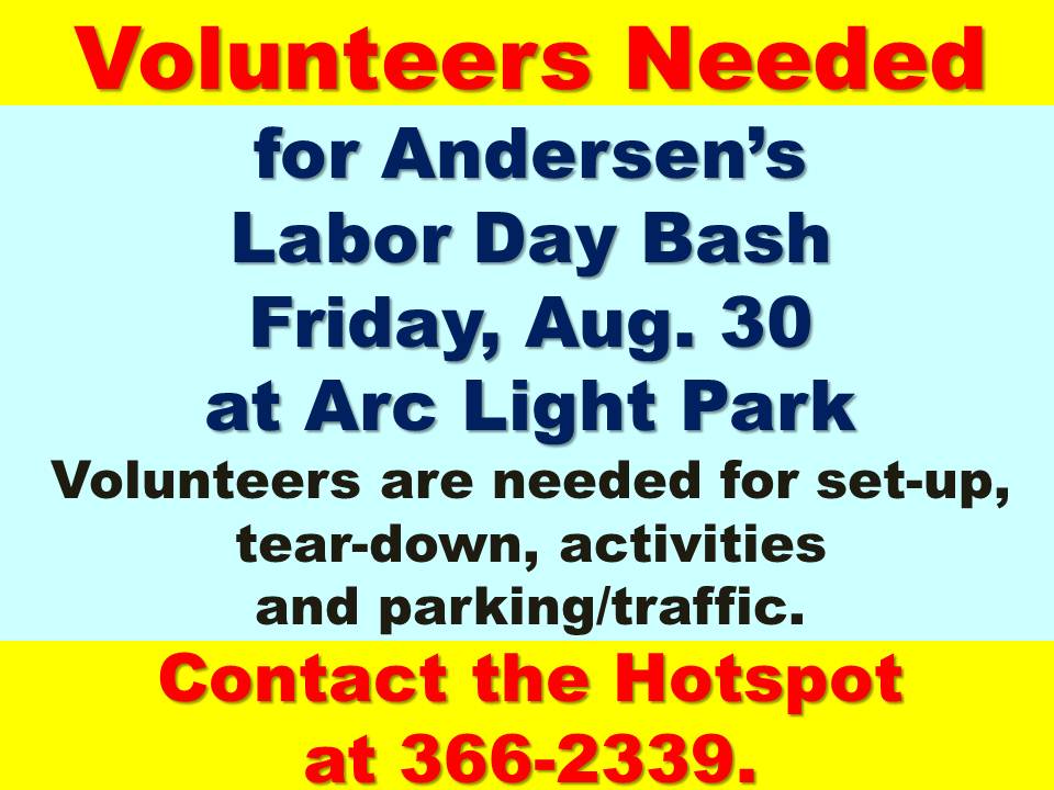 For more information or to volunteer, call the Hotspot at 366-2339.