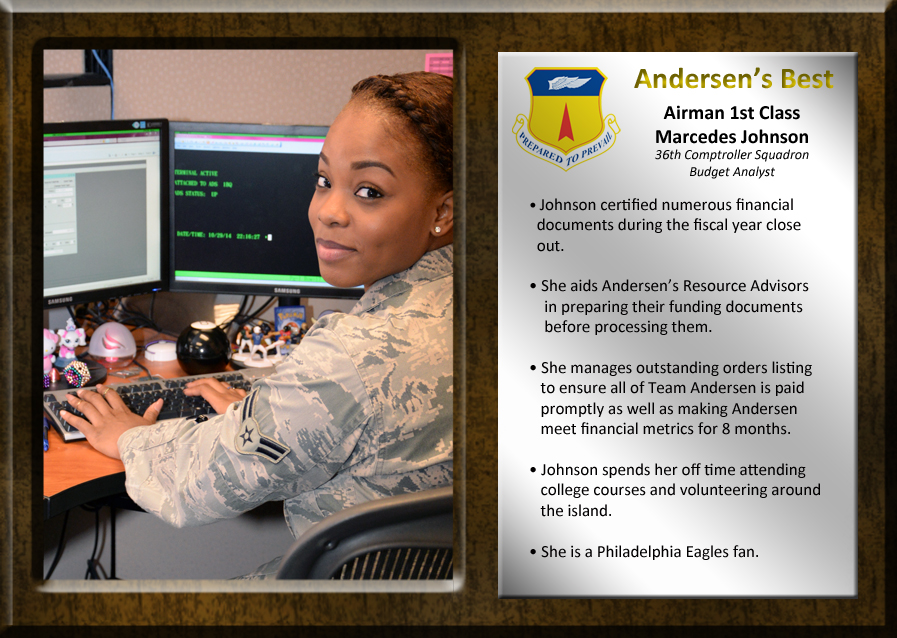 ANDERSEN AIR FORCE BASE, Guam -- Airman 1st Class Marcedes Johnson, 36th Comptroller Squadron budget analyst, certified numerous financial documents during the fiscal year close out. She manages outstanding orders listings to ensure all of Team Andersen is paid promptly as well as making Andersen meet financial metric for 8 months. (U.S. Air Force photo by Senior Airman Cierra Presentado/Released)
